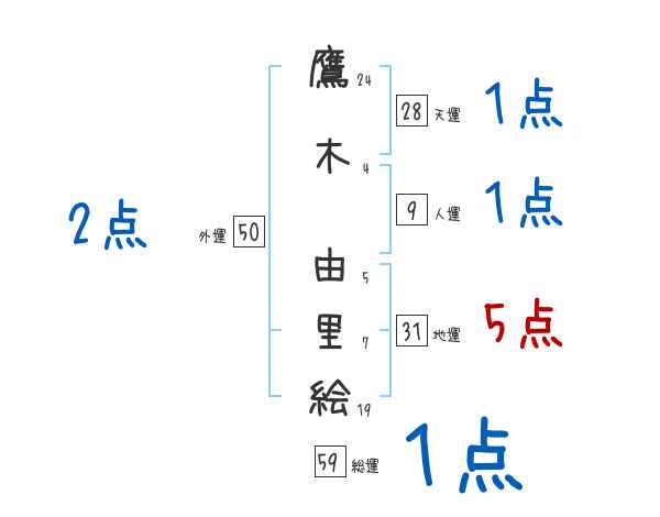 天運![]() | 鷹木由里絵さんの天運は28画の1つ星!家庭環境に注意。スポーツで活躍できる能力があるかも。 家系が持つ宿命的な運勢を表します。祖先から受け継いだ苗字ですので自分の力が及びません。家柄を象徴します。 |