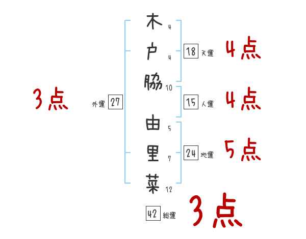 総運![]() | 木戸脇由里菜さんの総運は42画の3つ星!病気に注意。多芸であるが消極的でおとなしい。 あなたの人生を表す1番重要な運勢です。生涯を通じて影響する総合運となり、主に50歳以降の晩年期に影響を及ぼします。 |
