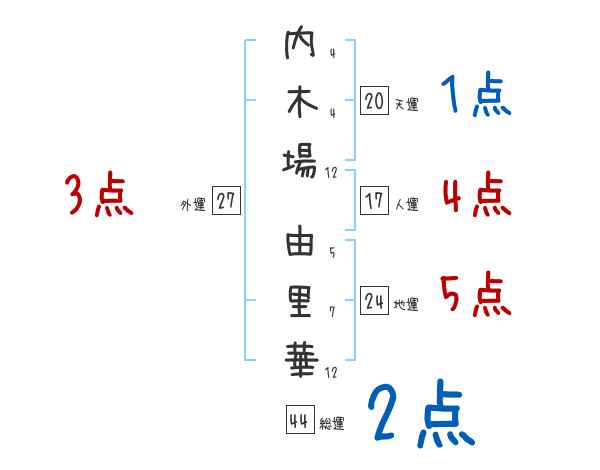 外運![]() | 内木場由里華さんの外運は27画の3つ星!頭脳明晰だが強情で摩擦が多い傾向。孤立に注意。 生活面を象徴する運勢です。外部から受ける影響力を表し、結婚運、家庭運や職場、環境への順応性を表します。 |