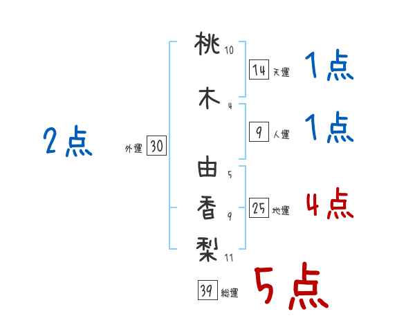 総運![]() | 桃木由香梨さんの総運は39画の5つ星!社交性に優れ人望が厚い。人の上に立ち成功する。 あなたの人生を表す1番重要な運勢です。生涯を通じて影響する総合運となり、主に50歳以降の晩年期に影響を及ぼします。 |