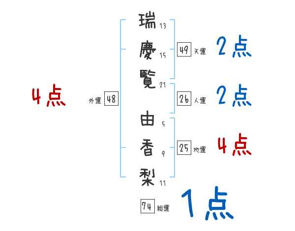 天運![]() | 瑞慶覧由香梨さんの天運は49画の2つ星!不安定な性格で明暗がある人生。周りの人には支援されやすい。 家系が持つ宿命的な運勢を表します。祖先から受け継いだ苗字ですので自分の力が及びません。家柄を象徴します。 |