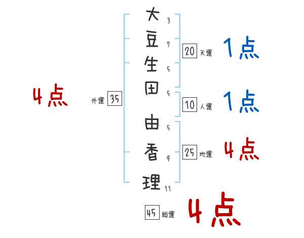 外運![]() | 大豆生田由香理さんの外運は35画の4つ星!温厚な性格で感受性が高い。穏和な性格で人望が厚い。 生活面を象徴する運勢です。外部から受ける影響力を表し、結婚運、家庭運や職場、環境への順応性を表します。 |