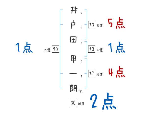 総運![]() | 井戸田甲一朗さんの総運は30画の2つ星!浮き沈みの激しさに注意しましょう。 あなたの人生を表す1番重要な運勢です。生涯を通じて影響する総合運となり、主に50歳以降の晩年期に影響を及ぼします。 |