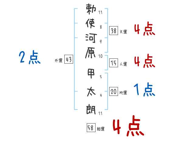 外運![]() | 勅使河原甲太朗さんの外運は43画の2つ星!頑固な性格で独立心が強いかも。やや非現実的で浪費に注意しましょう。 生活面を象徴する運勢です。外部から受ける影響力を表し、結婚運、家庭運や職場、環境への順応性を表します。 |