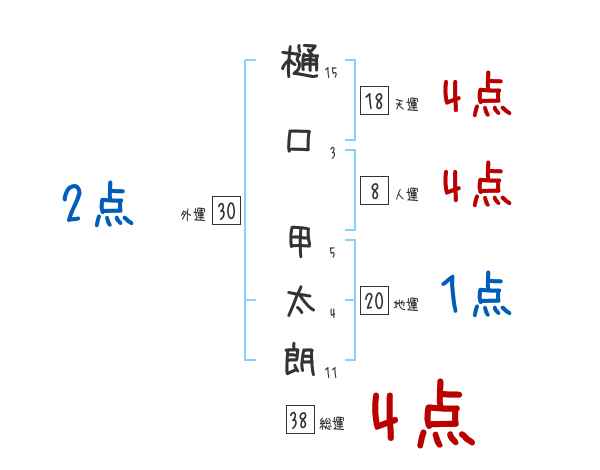 天運![]() | 樋口甲太朗さんの天運は18画の4つ星!情熱的で剛気。忍耐力があり信頼される。 家系が持つ宿命的な運勢を表します。祖先から受け継いだ苗字ですので自分の力が及びません。家柄を象徴します。 |