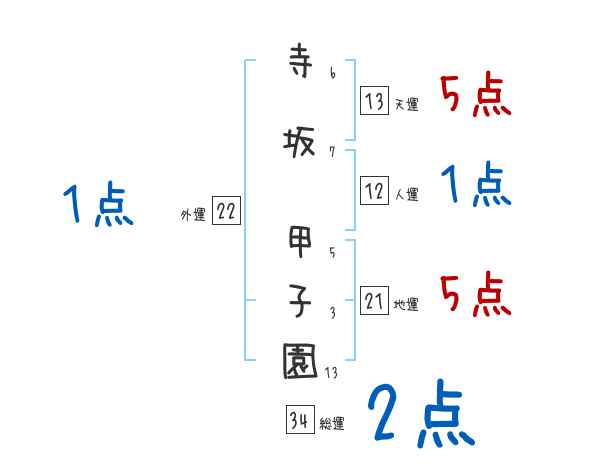 天運![]() | 寺坂甲子園さんの天運は13画の5つ星!才能に恵まれ人気がある。名声を手に入れる。円満な人生。 家系が持つ宿命的な運勢を表します。祖先から受け継いだ苗字ですので自分の力が及びません。家柄を象徴します。 |