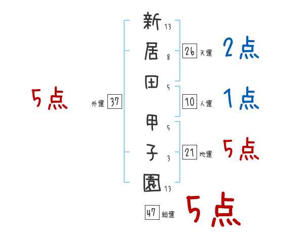 天運![]() | 新居田甲子園さんの天運は26画の2つ星!波瀾万丈かも。信頼できる人を大事にしましょう。 家系が持つ宿命的な運勢を表します。祖先から受け継いだ苗字ですので自分の力が及びません。家柄を象徴します。 |