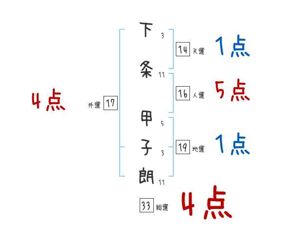 人運![]() | 下条甲子朗さんの人運は16画の5つ星!人望が厚く大きく発展する。逆転成功が見える。 性格や才能などを表す2番目に重要な運勢です。人間関係や協調性、社会的な成功に影響します。主に20歳から50歳ぐらいまでの中年期の運勢を表します。 |