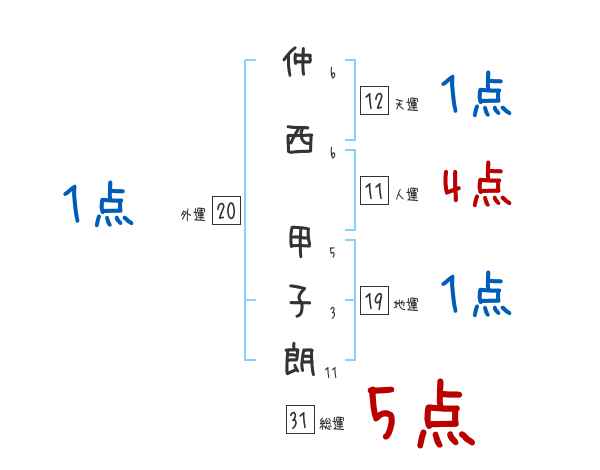 天運![]() | 仲西甲子朗さんの天運は12画の1つ星!簡単な失敗で諦めてしまいやすいかも。着実に行動すると良いでしょう。 家系が持つ宿命的な運勢を表します。祖先から受け継いだ苗字ですので自分の力が及びません。家柄を象徴します。 |