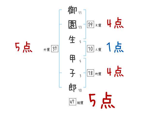 総運![]() | 御園生甲子郎さんの総運は47画の5つ星!実力が開花し発展する円満な人生。財に恵まれる。 あなたの人生を表す1番重要な運勢です。生涯を通じて影響する総合運となり、主に50歳以降の晩年期に影響を及ぼします。 |