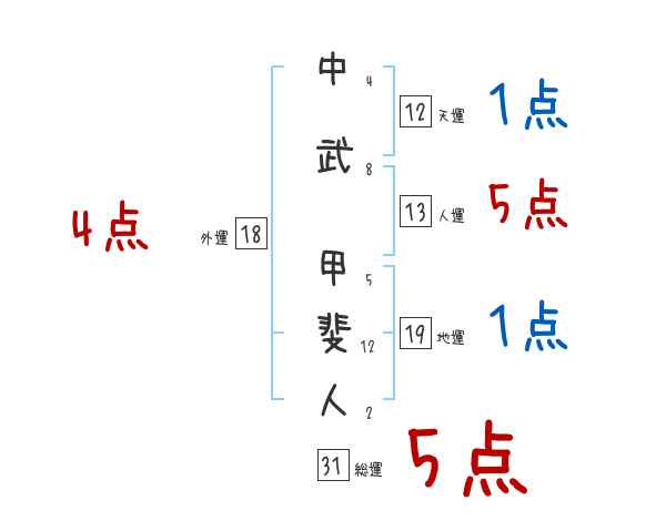 人運![]() | 中武甲斐人さんの人運は13画の5つ星!才能に恵まれ人気がある。名声を手に入れる。円満な人生。 性格や才能などを表す2番目に重要な運勢です。人間関係や協調性、社会的な成功に影響します。主に20歳から50歳ぐらいまでの中年期の運勢を表します。 |