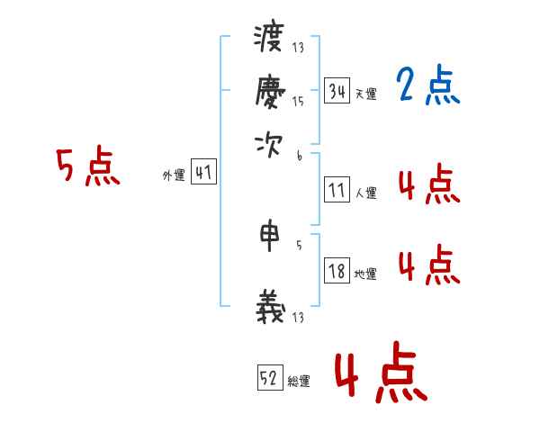 天運![]() | 渡慶次申義さんの天運は34画の2つ星!独創性に優れるが、自尊心が強く災難に注意しましょう。 家系が持つ宿命的な運勢を表します。祖先から受け継いだ苗字ですので自分の力が及びません。家柄を象徴します。 |