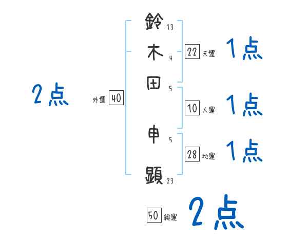 天運![]() | 鈴木田申顕さんの天運は22画の1つ星!努力することが苦手ないっぽう手先が器用。芸術性にも優れる。 家系が持つ宿命的な運勢を表します。祖先から受け継いだ苗字ですので自分の力が及びません。家柄を象徴します。 |