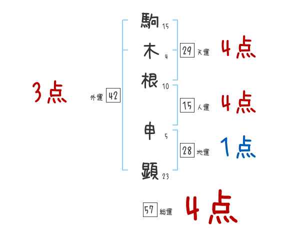 外運![]() | 駒木根申顕さんの外運は42画の3つ星!病気に注意。多芸であるが消極的でおとなしい。 生活面を象徴する運勢です。外部から受ける影響力を表し、結婚運、家庭運や職場、環境への順応性を表します。 |