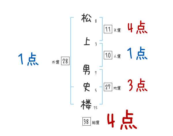 総運![]() | 松上男史楼さんの総運は38画の4つ星!温厚な性格で技術的な才能を発揮する。職人的な仕事に向いている。 あなたの人生を表す1番重要な運勢です。生涯を通じて影響する総合運となり、主に50歳以降の晩年期に影響を及ぼします。 |