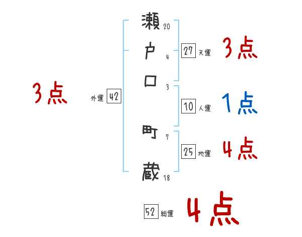 総運![]() | 瀬戸口町蔵さんの総運は52画の4つ星!先見性と独創性に優れ考える力がある。強運の持ち主。 あなたの人生を表す1番重要な運勢です。生涯を通じて影響する総合運となり、主に50歳以降の晩年期に影響を及ぼします。 |