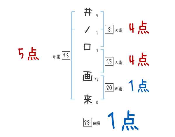 総運![]() | 井ノ口画来さんの総運は28画の1つ星!家庭環境に注意。スポーツで活躍できる能力があるかも。 あなたの人生を表す1番重要な運勢です。生涯を通じて影響する総合運となり、主に50歳以降の晩年期に影響を及ぼします。 |
