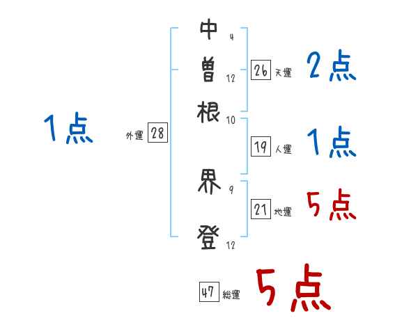 外運![]() | 中曽根界登さんの外運は28画の1つ星!家庭環境に注意。スポーツで活躍できる能力があるかも。 生活面を象徴する運勢です。外部から受ける影響力を表し、結婚運、家庭運や職場、環境への順応性を表します。 |