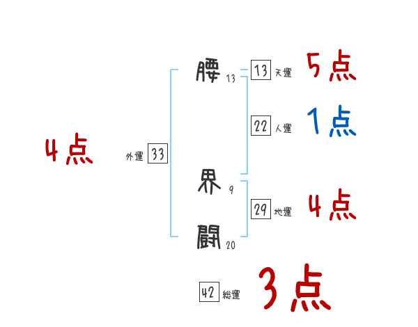 天運![]() | 腰界闘さんの天運は13画の5つ星!才能に恵まれ人気がある。名声を手に入れる。円満な人生。 家系が持つ宿命的な運勢を表します。祖先から受け継いだ苗字ですので自分の力が及びません。家柄を象徴します。 |