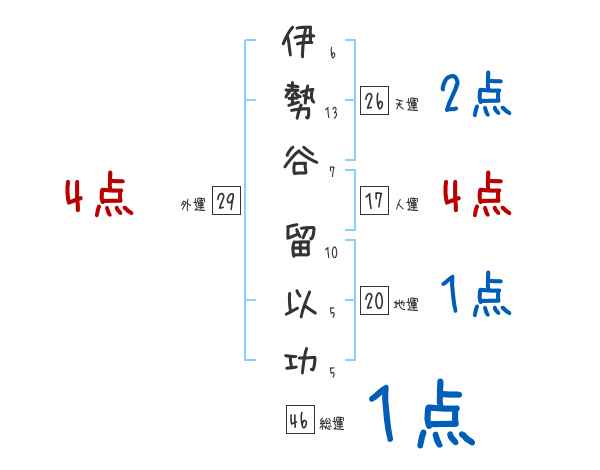 天運![]() | 伊勢谷留以功さんの天運は26画の2つ星!波瀾万丈かも。信頼できる人を大事にしましょう。 家系が持つ宿命的な運勢を表します。祖先から受け継いだ苗字ですので自分の力が及びません。家柄を象徴します。 |
