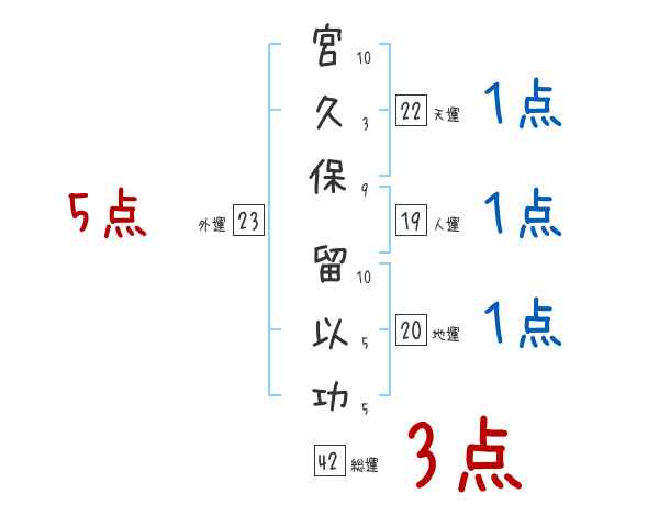 外運![]() | 宮久保留以功さんの外運は23画の5つ星!想像力に優れ活力がある。一代で成功し名誉を手に入れる。 生活面を象徴する運勢です。外部から受ける影響力を表し、結婚運、家庭運や職場、環境への順応性を表します。 |