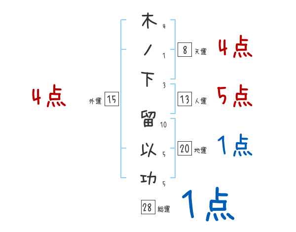 天運![]() | 木ノ下留以功さんの天運は8画の4つ星!勤勉家。根気強く努力し成功する。忍耐力がある。 家系が持つ宿命的な運勢を表します。祖先から受け継いだ苗字ですので自分の力が及びません。家柄を象徴します。 |