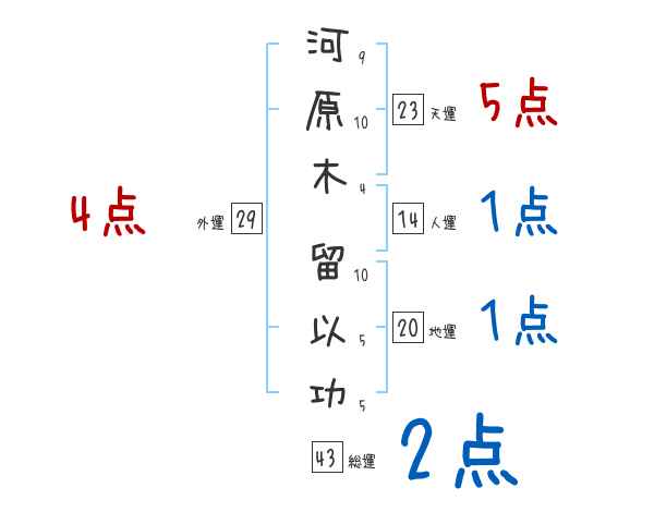 外運![]() | 河原木留以功さんの外運は29画の4つ星!完全主義で才能がある。厳格な心の持ち主。 生活面を象徴する運勢です。外部から受ける影響力を表し、結婚運、家庭運や職場、環境への順応性を表します。 |
