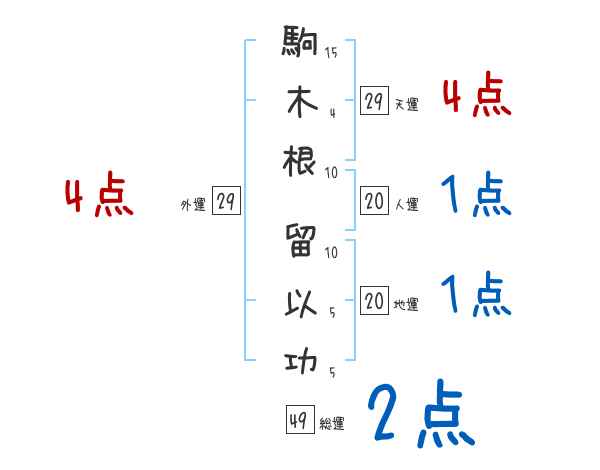 外運![]() | 駒木根留以功さんの外運は29画の4つ星!完全主義で才能がある。厳格な心の持ち主。 生活面を象徴する運勢です。外部から受ける影響力を表し、結婚運、家庭運や職場、環境への順応性を表します。 |