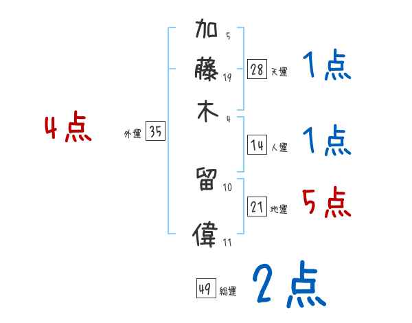 天運![]() | 加藤木留偉さんの天運は28画の1つ星!家庭環境に注意。スポーツで活躍できる能力があるかも。 家系が持つ宿命的な運勢を表します。祖先から受け継いだ苗字ですので自分の力が及びません。家柄を象徴します。 |