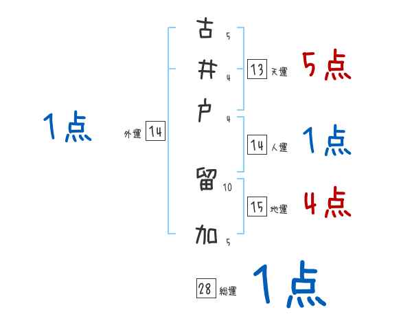 天運![]() | 古井戸留加さんの天運は13画の5つ星!才能に恵まれ人気がある。名声を手に入れる。円満な人生。 家系が持つ宿命的な運勢を表します。祖先から受け継いだ苗字ですので自分の力が及びません。家柄を象徴します。 |