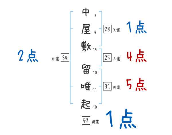 総運![]() | 中屋敷留唯起さんの総運は59画の1つ星!意志の弱さであきらめることが多いかも。粘り強さが必要。 あなたの人生を表す1番重要な運勢です。生涯を通じて影響する総合運となり、主に50歳以降の晩年期に影響を及ぼします。 |