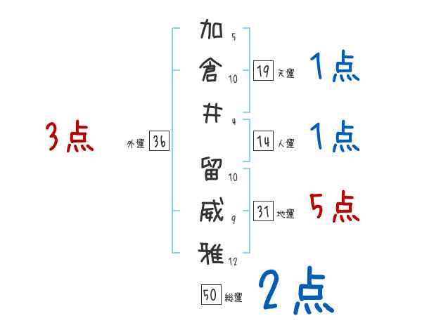 外運![]() | 加倉井留威雅さんの外運は36画の3つ星!先見性が豊かです。多少神経質で苦労することも。 生活面を象徴する運勢です。外部から受ける影響力を表し、結婚運、家庭運や職場、環境への順応性を表します。 |