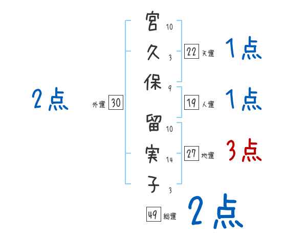 外運![]() | 宮久保留実子さんの外運は30画の2つ星!浮き沈みの激しさに注意しましょう。 生活面を象徴する運勢です。外部から受ける影響力を表し、結婚運、家庭運や職場、環境への順応性を表します。 |