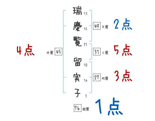 天運![]() | 瑞慶覧留実子さんの天運は49画の2つ星!不安定な性格で明暗がある人生。周りの人には支援されやすい。 家系が持つ宿命的な運勢を表します。祖先から受け継いだ苗字ですので自分の力が及びません。家柄を象徴します。 |