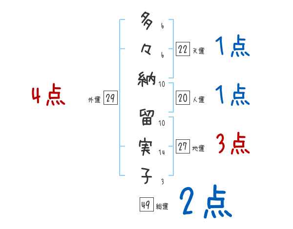外運![]() | 多々納留実子さんの外運は29画の4つ星!完全主義で才能がある。厳格な心の持ち主。 生活面を象徴する運勢です。外部から受ける影響力を表し、結婚運、家庭運や職場、環境への順応性を表します。 |
