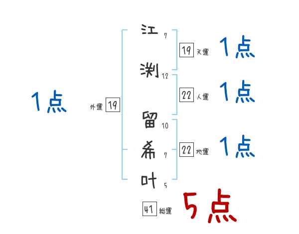 外運![]() | 江渕留希叶さんの外運は19画の1つ星!優れた才能を持ちますが、協調性が足りないことも。周りの人と協力する事を意識しましょう。 生活面を象徴する運勢です。外部から受ける影響力を表し、結婚運、家庭運や職場、環境への順応性を表します。 |