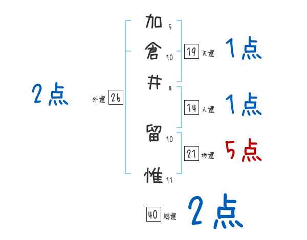 外運![]() | 加倉井留惟さんの外運は26画の2つ星!波瀾万丈かも。信頼できる人を大事にしましょう。 生活面を象徴する運勢です。外部から受ける影響力を表し、結婚運、家庭運や職場、環境への順応性を表します。 |