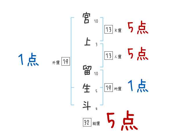 外運![]() | 宮上留生斗さんの外運は19画の1つ星!優れた才能を持ちますが、協調性が足りないことも。周りの人と協力する事を意識しましょう。 生活面を象徴する運勢です。外部から受ける影響力を表し、結婚運、家庭運や職場、環境への順応性を表します。 |
