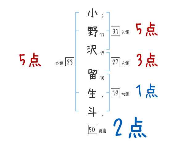 外運![]() | 小野沢留生斗さんの外運は23画の5つ星!想像力に優れ活力がある。一代で成功し名誉を手に入れる。 生活面を象徴する運勢です。外部から受ける影響力を表し、結婚運、家庭運や職場、環境への順応性を表します。 |
