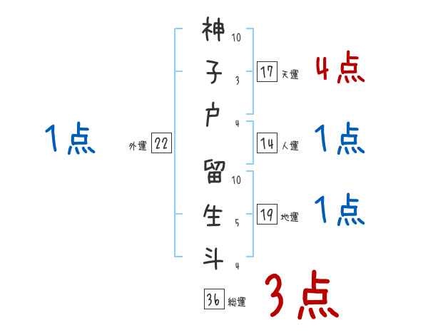 総運![]() | 神子戸留生斗さんの総運は36画の3つ星!先見性が豊かです。多少神経質で苦労することも。 あなたの人生を表す1番重要な運勢です。生涯を通じて影響する総合運となり、主に50歳以降の晩年期に影響を及ぼします。 |