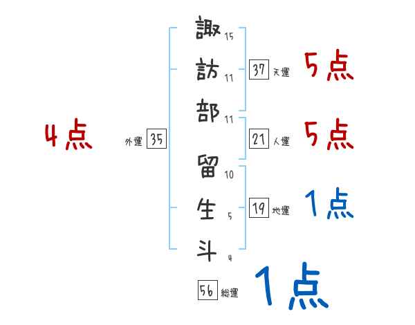 外運![]() | 諏訪部留生斗さんの外運は35画の4つ星!温厚な性格で感受性が高い。穏和な性格で人望が厚い。 生活面を象徴する運勢です。外部から受ける影響力を表し、結婚運、家庭運や職場、環境への順応性を表します。 |