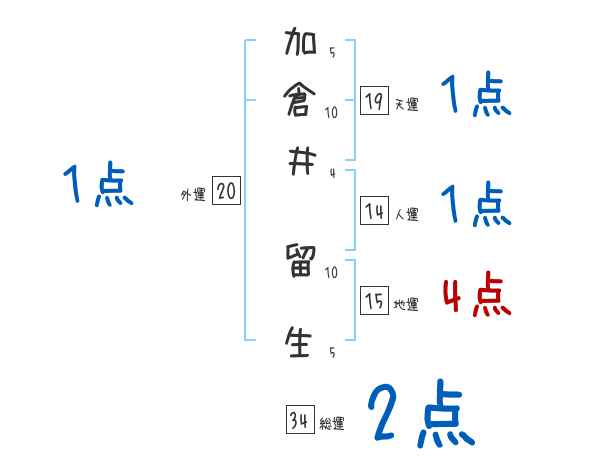 天運![]() | 加倉井留生さんの天運は19画の1つ星!優れた才能を持ちますが、協調性が足りないことも。周りの人と協力する事を意識しましょう。 家系が持つ宿命的な運勢を表します。祖先から受け継いだ苗字ですので自分の力が及びません。家柄を象徴します。 |