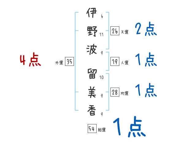 外運![]() | 伊野波留美香さんの外運は35画の4つ星!温厚な性格で感受性が高い。穏和な性格で人望が厚い。 生活面を象徴する運勢です。外部から受ける影響力を表し、結婚運、家庭運や職場、環境への順応性を表します。 |