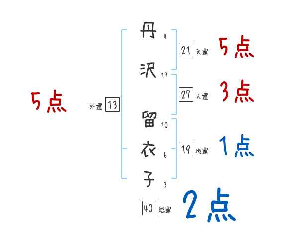 天運![]() | 丹沢留衣子さんの天運は21画の5つ星!統率力がある。独立し成功する。名誉を手に入れる。 家系が持つ宿命的な運勢を表します。祖先から受け継いだ苗字ですので自分の力が及びません。家柄を象徴します。 |