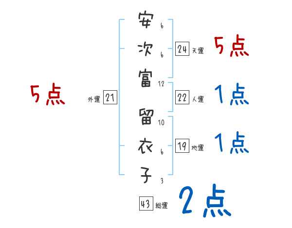 天運![]() | 安次富留衣子さんの天運は24画の5つ星!家庭運が良く順調な人生。金運にも恵まれる。 家系が持つ宿命的な運勢を表します。祖先から受け継いだ苗字ですので自分の力が及びません。家柄を象徴します。 |