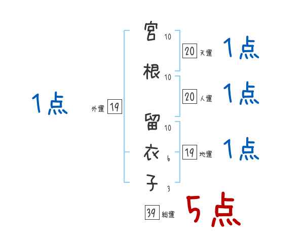外運![]() | 宮根留衣子さんの外運は19画の1つ星!優れた才能を持ちますが、協調性が足りないことも。周りの人と協力する事を意識しましょう。 生活面を象徴する運勢です。外部から受ける影響力を表し、結婚運、家庭運や職場、環境への順応性を表します。 |