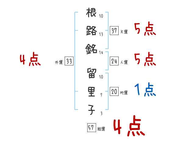 総運![]() | 根路銘留里子さんの総運は57画の4つ星!向上心があり人望がある。地位を得る。 あなたの人生を表す1番重要な運勢です。生涯を通じて影響する総合運となり、主に50歳以降の晩年期に影響を及ぼします。 |