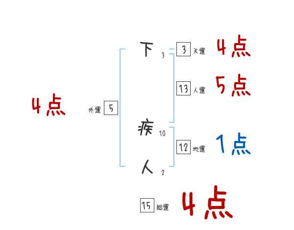 天運![]() | 下疾人さんの天運は3画の4つ星!活動的で才能に恵まれ、多くの信頼を得る。希望に満ち成長する。 家系が持つ宿命的な運勢を表します。祖先から受け継いだ苗字ですので自分の力が及びません。家柄を象徴します。 |