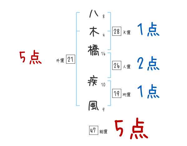 | 天運  | 八木橋疾風さんの天運は28画の1つ星!家庭環境に注意。スポーツで活躍できる能力があるかも。家系が持つ宿命的な運勢を表します。祖先から受け継いだ苗字ですので自分の力が及びません。家柄を象徴します。 |