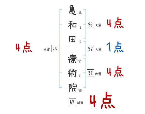 総運![]() | 亀和田療術院さんの総運は67画の4つ星!幸運な人生。堅実な性格で調和し、周りの人に助けられる。 あなたの人生を表す1番重要な運勢です。生涯を通じて影響する総合運となり、主に50歳以降の晩年期に影響を及ぼします。 |